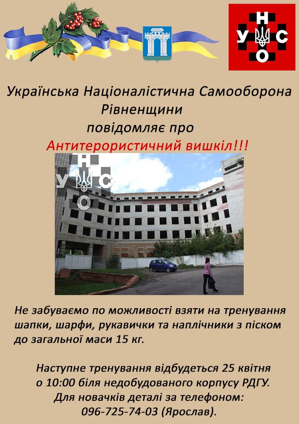 25 квітня в м.Рівне, вул.Чернишевського, відбудеться "Антитерористичний вишкіл" Рівненського обласного осередку УНСО.