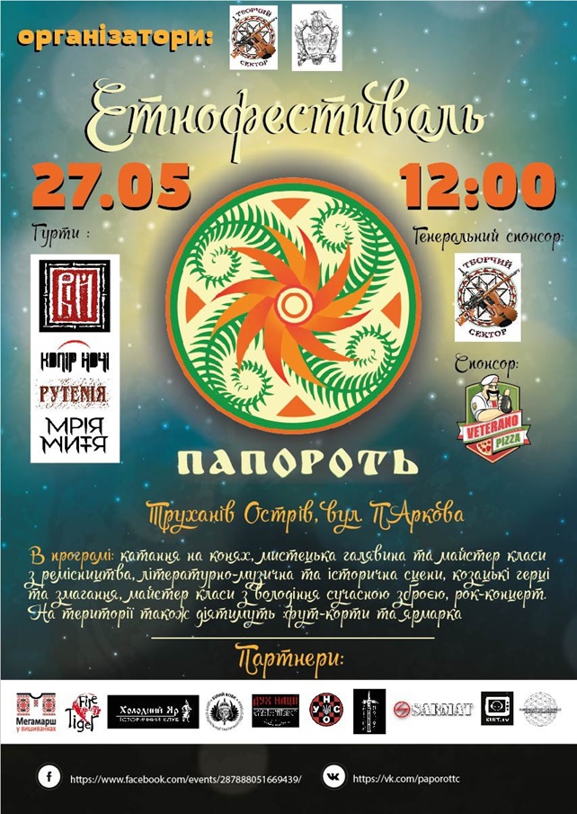27 травня о 12 годині з нагоди відзначення Дня міста Київ на Трухановому острові (галявина біля вул. Паркова) відбудеться Молодіжний патріотичний етно-фестиваль «Папороть».