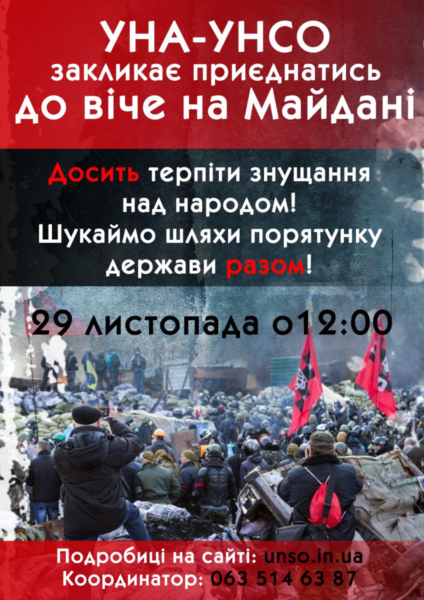 УНА-УНСО ЗАКЛИКАЄ ПРИЄДНАТИСЬ ДО ВІЧЕ НА МАЙДАНІ 29 ЛИСТОПАДА О 12:00!