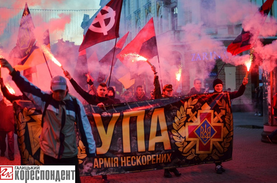Колону активістів пройшлася “стометрівкою”, несучи банер з написом “УПА. Армія нескорених”. Також дорогою колона палила фаєри.