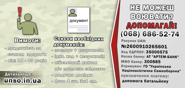 З питань допомоги батальйону телефонуйте до Інформаційного центру УНСО: 068 686 52 74.