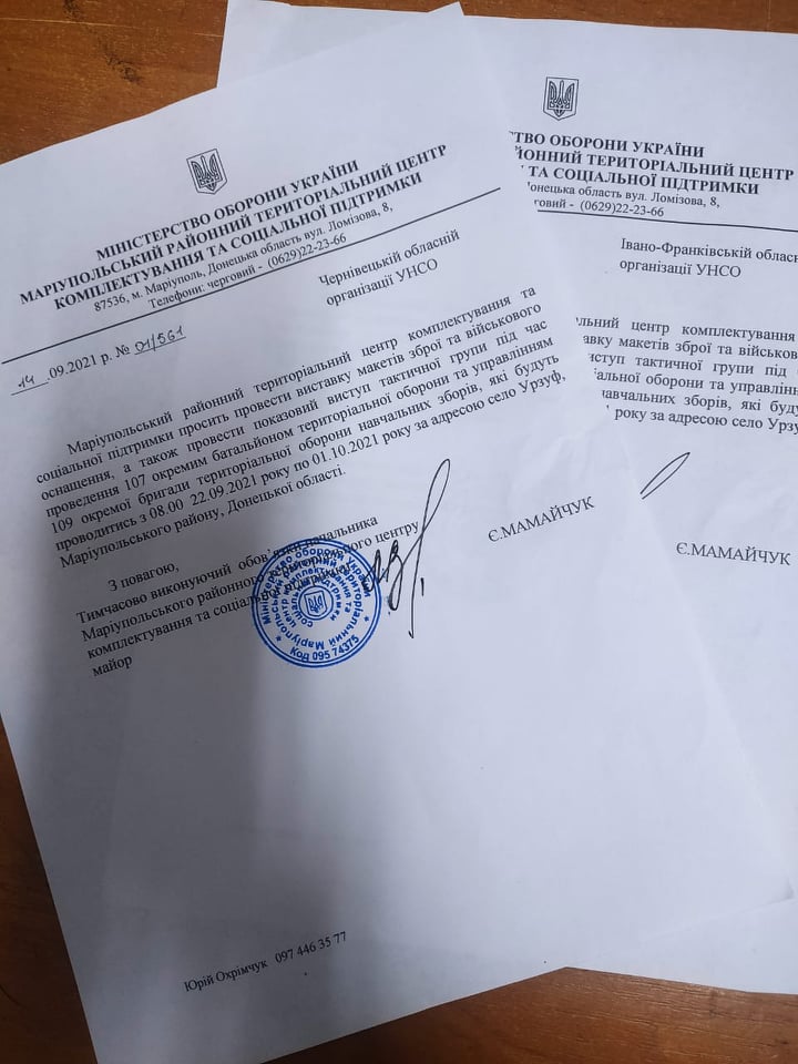 Чернівецька, Івано-Франківська та Донецька крайові команди УНСО взяли участь у 10-денних зборах підрозділів територіальної оборони ЗСУ на Донеччині. Збори розпочались 22 вересня і тривали до 1 жовтня. За цей час, інструктори УНСО провели для учасників зборів ознайомчі лекції з озброєння та військового спорядження, на яких розповіли про будову та тактичні харакетристики наявних зразків озброєння. Також, для резервістів та контрактників тероборони були проведені практичні заняття з індивідуальної підготовки, тактики дій малих груп, основ антидиверсійної боротьби, топографії, військової медицини та деяких інших військових дисциплін.