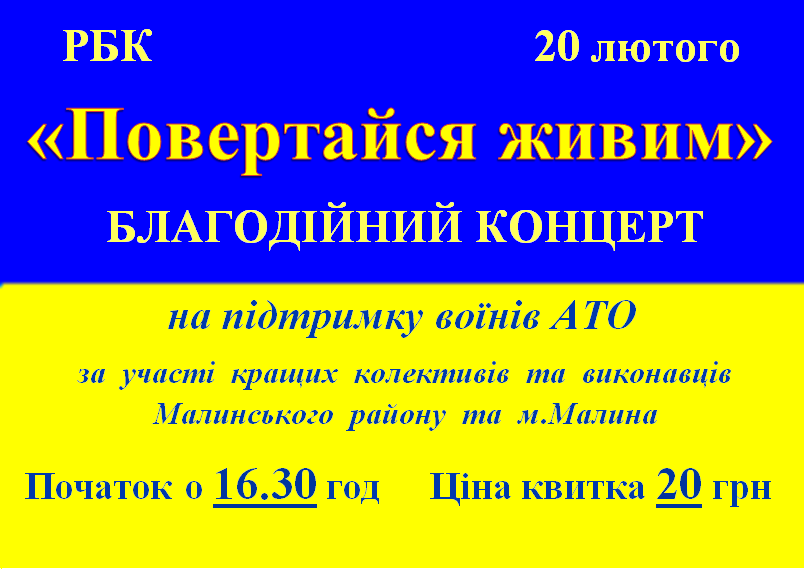 20 лютого о 16.30 в Малинському районному будинку культури відбудеться благодійний концерт "Повертайся живим" на підтримку воїнiв АТО.