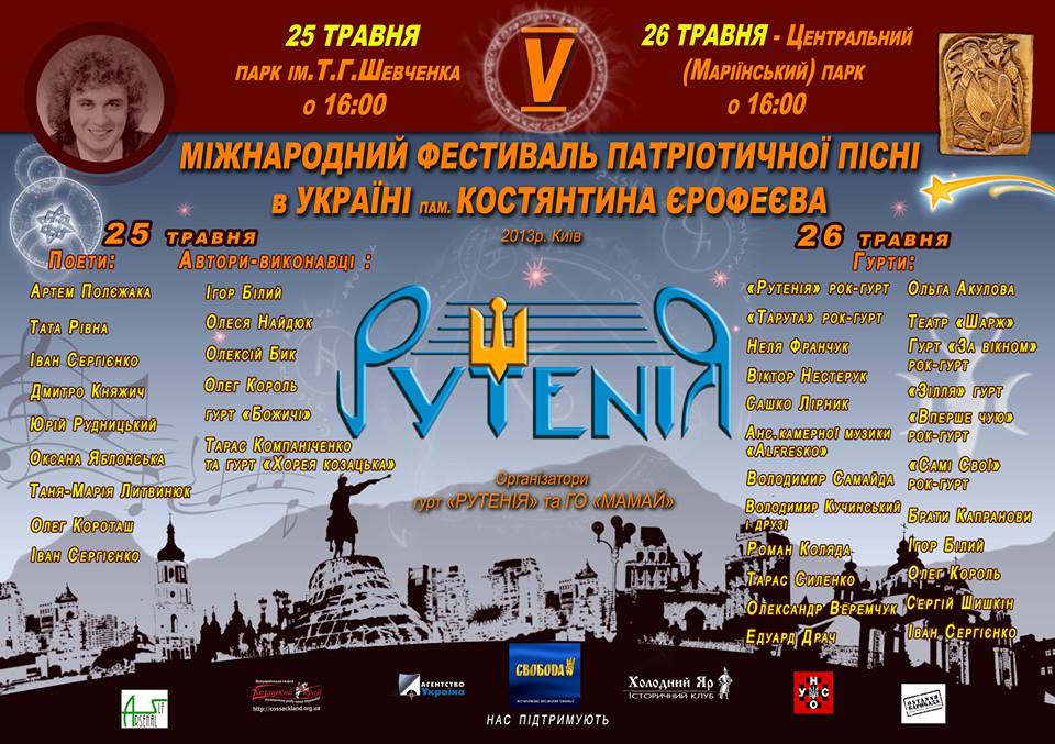 П’ятий Фестиваль патріотичної пісні в Україні «Рутенія» (пам’яті Костянтина Єрофеєва) відбудеться в рамках Днів Києва 25-26 травня 2013 року, на відкритих майданчиках міста.