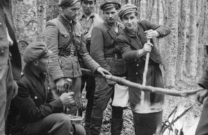 Приготування їжі. У відділах УПА під час таборування їжу готували спеціально призначені для цього люди – кухарі. Згадки про їхню наявність є у різних повстанських спогадах. Під час маршів, особливо невеликими групами практикували колективне приготування їжі найпростішими способами (запікання, варіння на відкритому вогні у лісі). "Печемо на патичках м'ясо. Потім їмо смачну партизанську зупу".