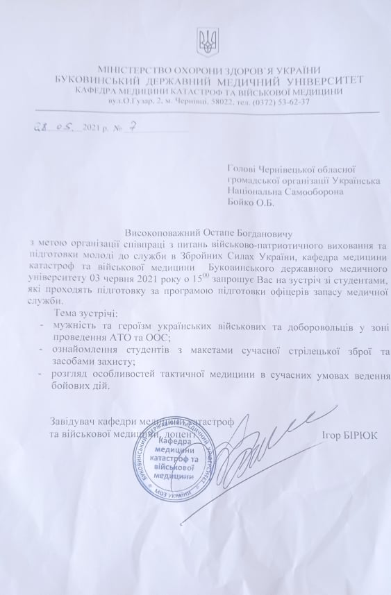 Дякуємо за запрошення і допомогу колективу БДМУ, а також завідувачу кафедри медицини катастроф та військової медицини Бірюку Ігорю Григоровичу.
