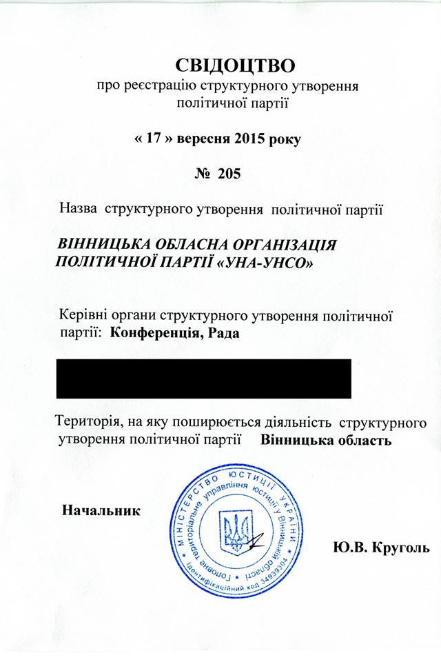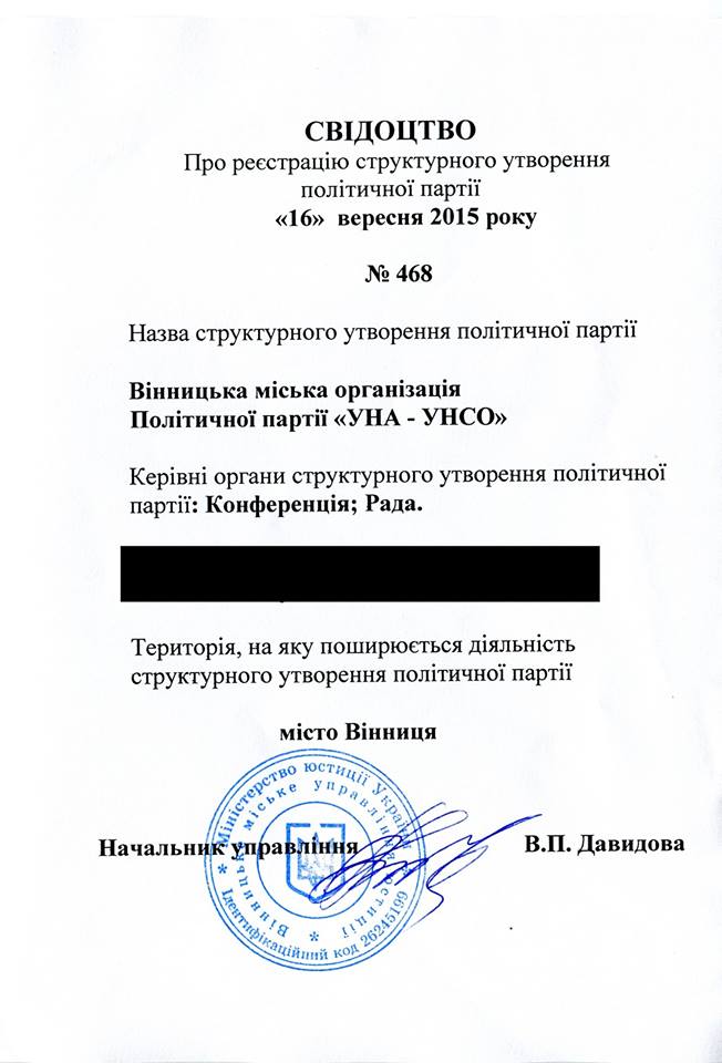 Вінницьке обласне та Вінницьке міське управління юстиції зареєстрували Вінницьку обласну та Вінницьку міську організації політичної партії УНА-УНСО.